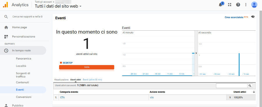 Adesso che gli eventi vengono generati, vediamo come visualizzarli sulla dashboard del progetto Google Analytics.