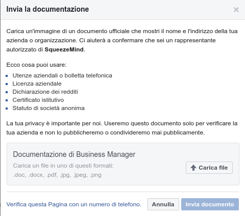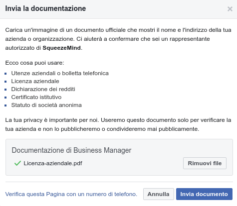 Se invece preferisci verificare la pagina con un documento aziendale, come ad esempio la bolletta della luce dell’ufficio, quella telefonica o la visura camerale, clicca sul link Verifica questa Pagina con i documenti che trovi in basso a sinistra del popup di verifica tramite telefono.