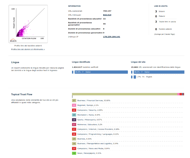 Oltretutto è possibile avere una panoramica della lingua utilizzata nelle pagine che contengono backlinks, di quella della anchor text e, come già visto, del Topical Trust Flow.